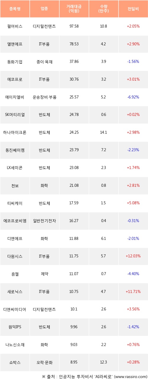 기관 투자자의 순매수 상위 20개 종목은 펄어비스, 엘앤에프, 동화기업, 에코프로, 에이치엘비, SK머티리얼즈, 하나마이크론, 동진쎄미켐, LX세미콘, 천보등이다.