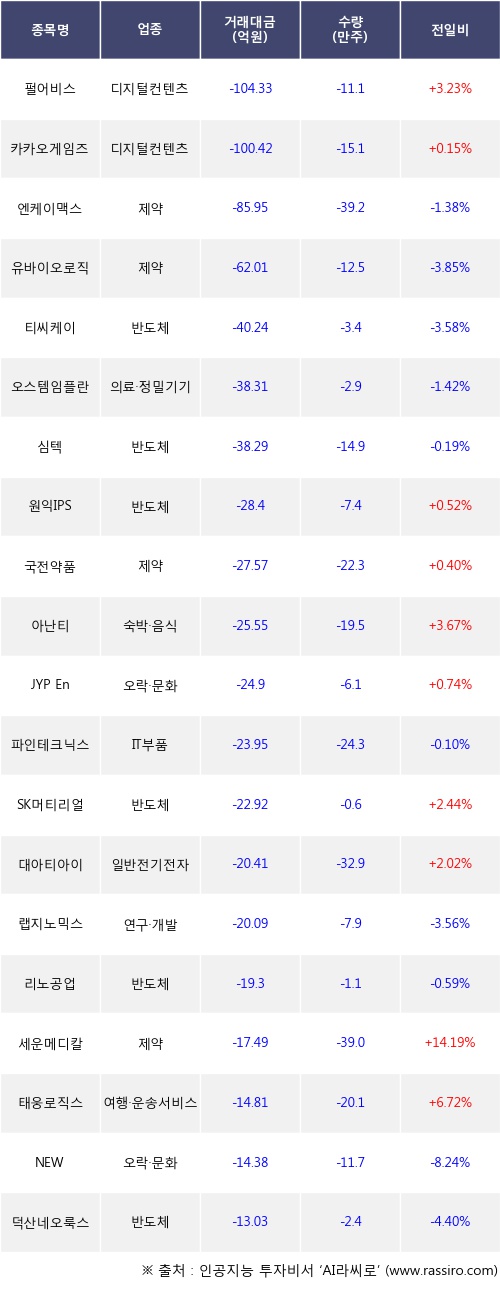 외국인 투자자의 순매도 상위 20개 종목은 펄어비스, 카카오게임즈, 엔케이맥스, 유바이오로직스, 티씨케이, 오스템임플란트, 심텍, 원익IPS, 국전약품, 아난티등이다.