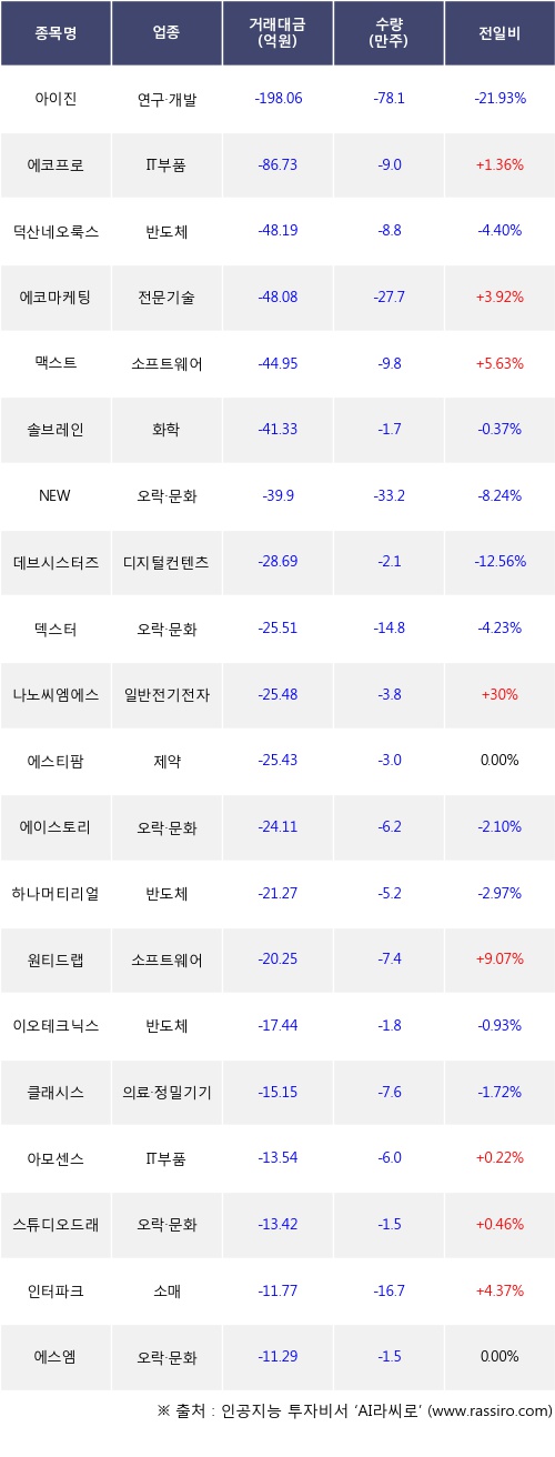 기관 투자자의 순매도 상위 20개 종목은 아이진, 에코프로, 덕산네오룩스, 에코마케팅, 맥스트, 솔브레인, NEW, 데브시스터즈, 덱스터, 나노씨엠에스등이다.