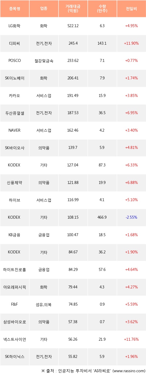 LG화학, 디피씨, POSCO 등은 전일 대비 주가가 상승했고, KODEX 200선물인버스2X 등은 주가가 하락했다.