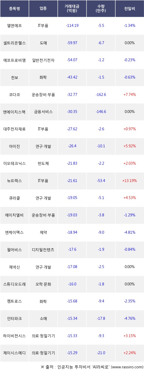 기관 투자자의 순매도 상위 20개 종목은 엘앤에프, 셀트리온헬스케어, 에코프로비엠, 천보, 코다코, 엔에이치스팩21호, 대주전자재료, 아이진, 이오테크닉스, 뉴프렉스등이다.
