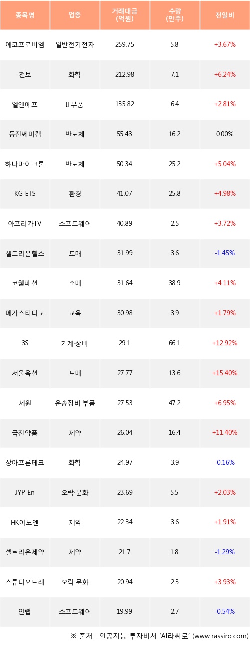 에코프로비엠, 천보, 엘앤에프 등은 전일 대비 주가가 상승했고, 셀트리온헬스케어, 상아프론테크, 셀트리온제약 등은 주가가 하락했다.