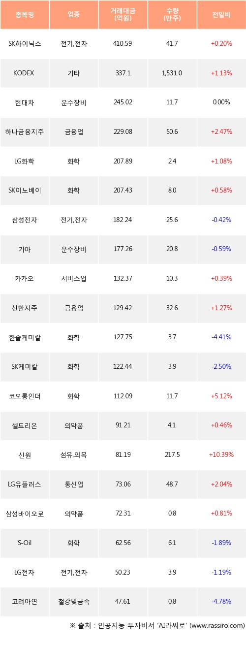 SK하이닉스, KODEX 200선물인버스2X, 하나금융지주 등은 전일 대비 주가가 상승했고, 삼성전자, 기아, 한솔케미칼 등은 주가가 하락했다.