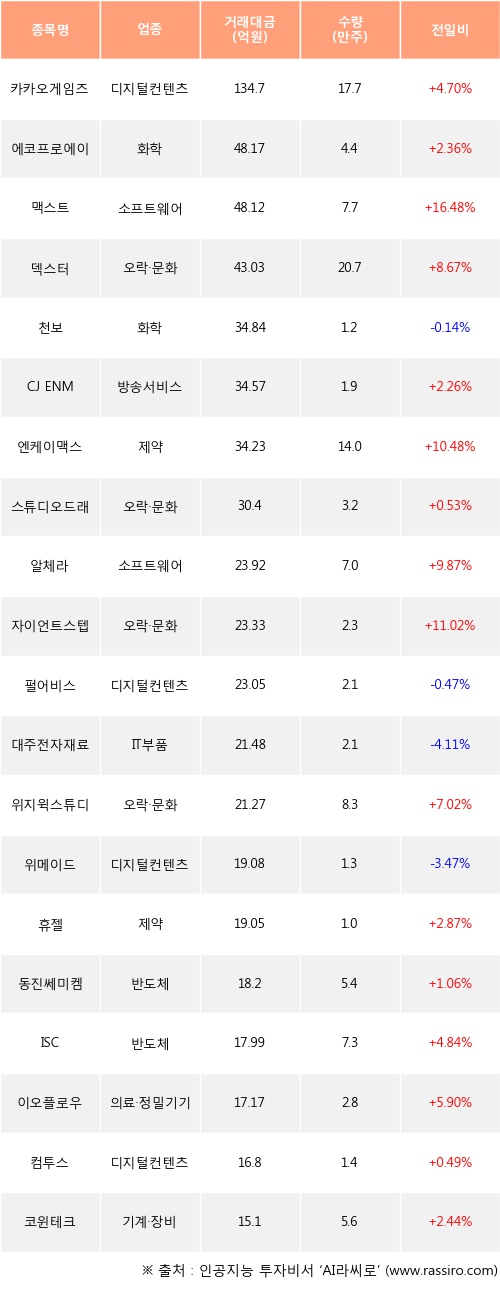 기관 투자자의 순매수 상위 20개 종목은 카카오게임즈, 에코프로에이치엔, 맥스트, 덱스터, 천보, CJ ENM, 엔케이맥스, 스튜디오드래곤, 알체라, 자이언트스텝등이다.