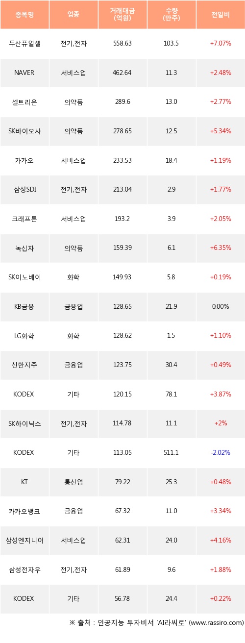 두산퓨얼셀, NAVER, 셀트리온 등은 전일 대비 주가가 상승했고, KODEX 200선물인버스2X 등은 주가가 하락했다.