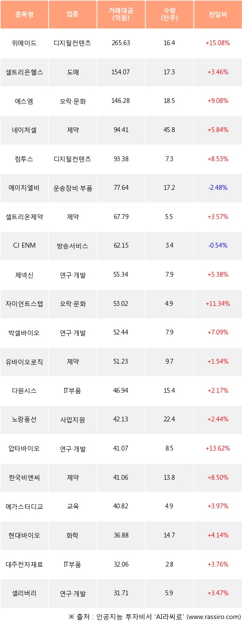 위메이드, 셀트리온헬스케어, 에스엠 등은 전일 대비 주가가 상승했고, 에이치엘비, CJ ENM 등은 주가가 하락했다.