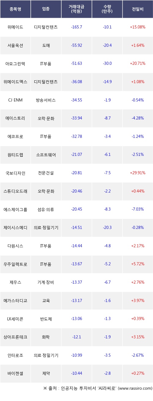 기관 투자자의 순매도 상위 20개 종목은 위메이드, 서울옥션, 아모그린텍, 위메이드맥스, CJ ENM, 에이스토리, 에코프로, 원티드랩, 국보디자인, 스튜디오드래곤등이다.