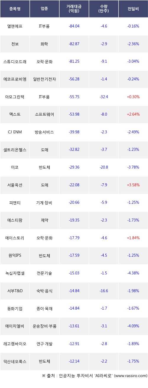 기관 투자자의 순매도 상위 20개 종목은 엘앤에프, 천보, 스튜디오드래곤, 에코프로비엠, 아모그린텍, 맥스트, CJ ENM, 셀트리온헬스케어, 미코, 서울옥션등이다.