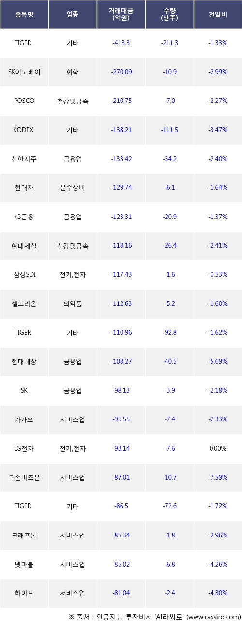 이날 기관 투자자가 순매도한 종목들 중에 TIGER 차이나전기차SOLACTIVE, SK이노베이션, POSCO 등은 전일 대비 주가가 하락했다.