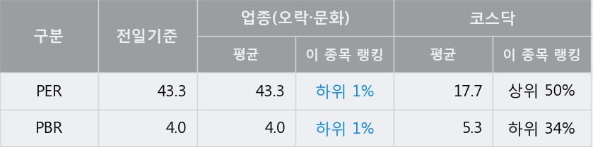 전일 종가를 기준으로 이 종목의 PER는 43.3배, PBR은 4.0배이다. PER는 오락·문화업종의 평균 PER 43.3배와 동일한 수준으로 업종 내에서 하위 1%에 있고, PBR은 오락·문화업종의 평균 PBR 4.0배와 동일한 수준으로 업종 내에서 하위 1%에 위치한다. 보통 낮은 PER는 현재 시장이 해당 기업의 가치를 상대적으로 낮게 평가하고 있다고 해석될 수 있다.