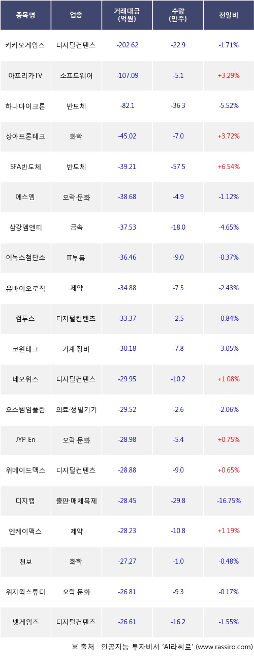 외국인 투자자의 순매도 상위 20개 종목은 카카오게임즈, 아프리카TV, 하나마이크론, 상아프론테크, SFA반도체, 에스엠, 삼강엠앤티, 이녹스첨단소재, 유바이오로직스, 컴투스등이다.