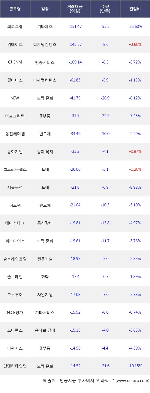 기관 투자자의 순매도 상위 20개 종목은 피코그램, 위메이드, CJ ENM, 펄어비스, NEW, 아모그린텍, 동진쎄미켐, 동화기업, 셀트리온헬스케어, 서울옥션등이다.