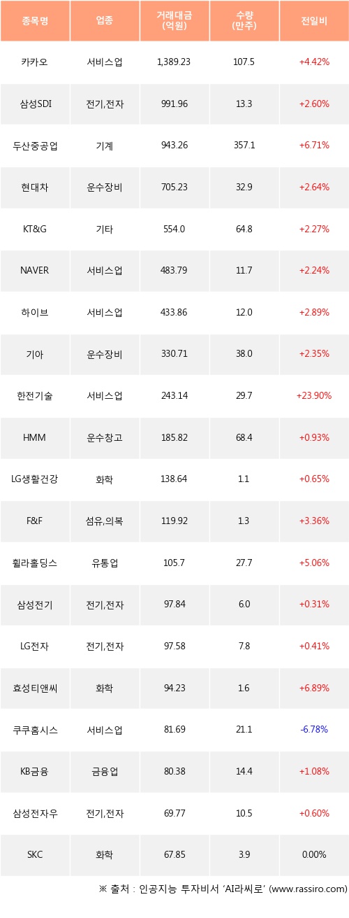 카카오, 삼성SDI, 두산중공업 등은 전일 대비 주가가 상승했고, 쿠쿠홈시스 등은 주가가 하락했다.