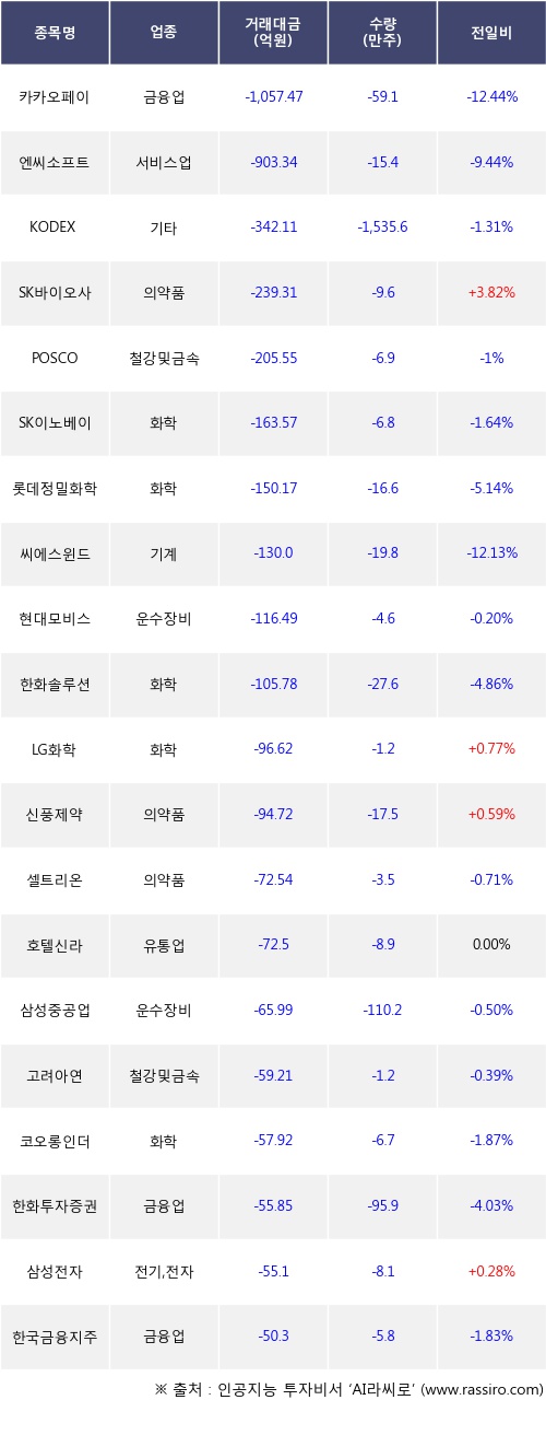 외국인 투자자의 순매도 상위 20개 종목은 카카오페이, 엔씨소프트, KODEX 200선물인버스2X, SK바이오사이언스, POSCO, SK이노베이션, 롯데정밀화학, 씨에스윈드, 현대모비스, 한화솔루션등이다.