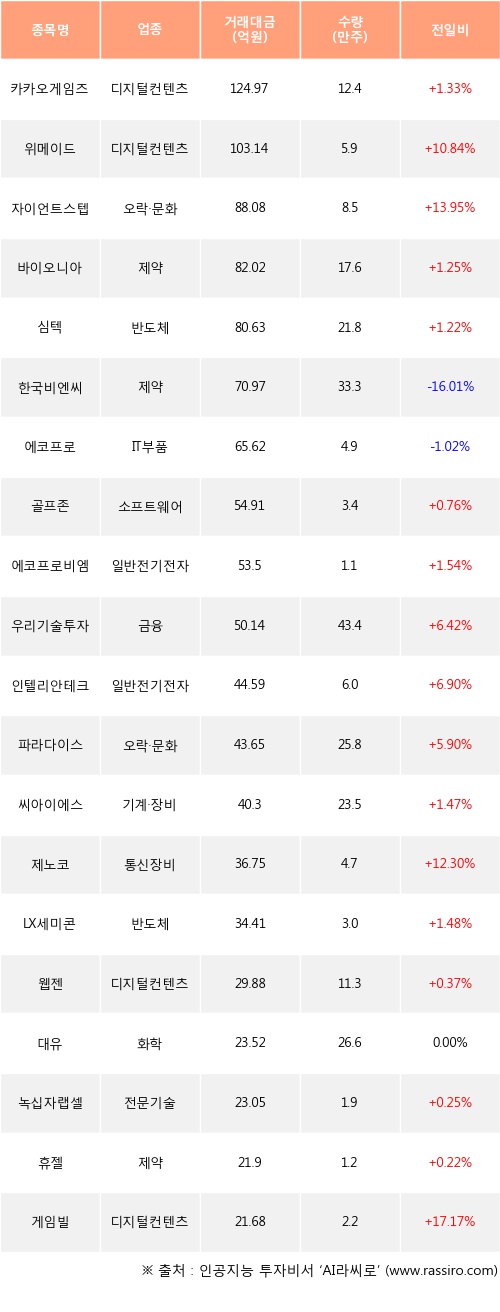 외국인 투자자의 순매수 상위 20개 종목은 카카오게임즈, 위메이드, 자이언트스텝, 바이오니아, 심텍, 한국비엔씨, 에코프로, 골프존, 에코프로비엠, 우리기술투자등이다.