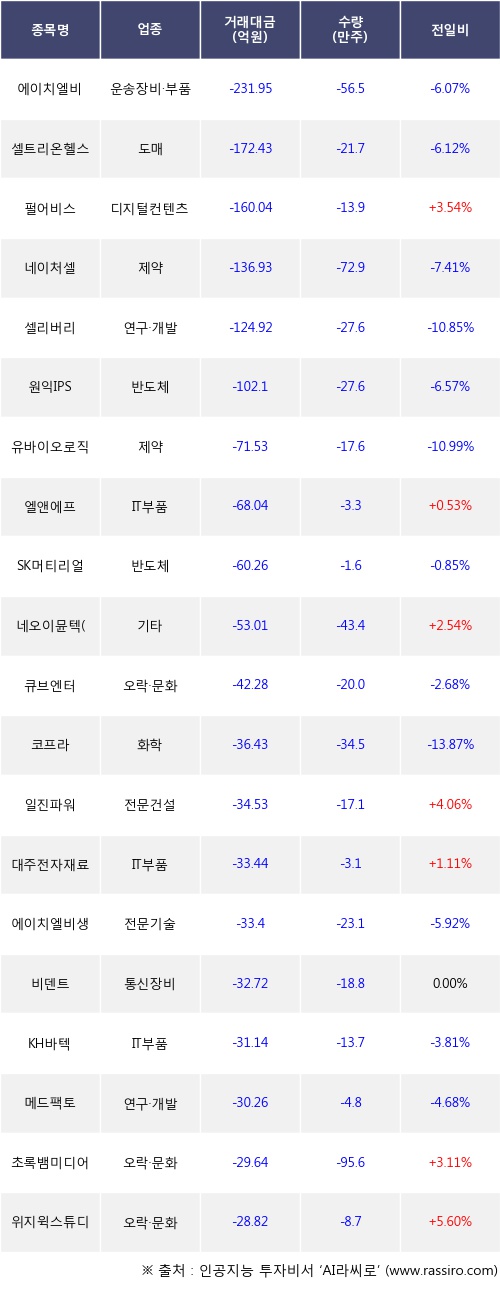 외국인 투자자의 순매도 상위 20개 종목은 에이치엘비, 셀트리온헬스케어, 펄어비스, 네이처셀, 셀리버리, 원익IPS, 유바이오로직스, 엘앤에프, SK머티리얼즈, 네오이뮨텍(Reg.S)등이다.