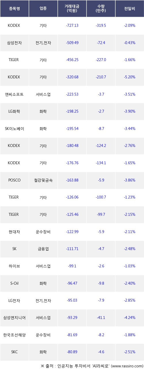 이날 기관 투자자가 순매도한 종목들 중에 KODEX 레버리지, 삼성전자, TIGER 차이나전기차SOLACTIVE 등은 전일 대비 주가가 하락했다.