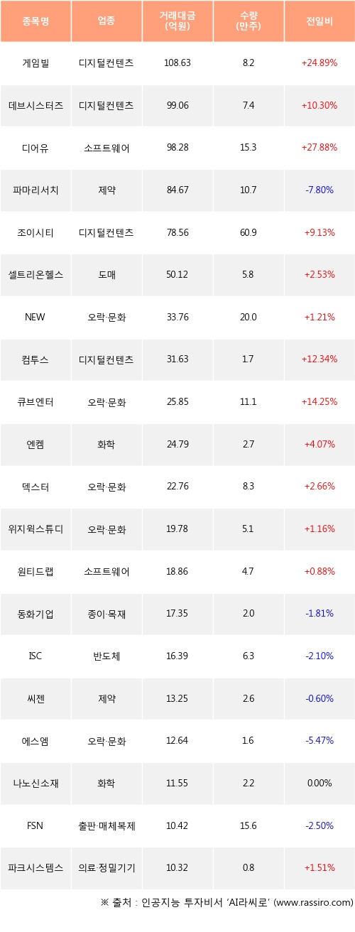게임빌, 데브시스터즈, 디어유 등은 전일 대비 주가가 상승했고, 파마리서치, 동화기업, ISC 등은 주가가 하락했다.
