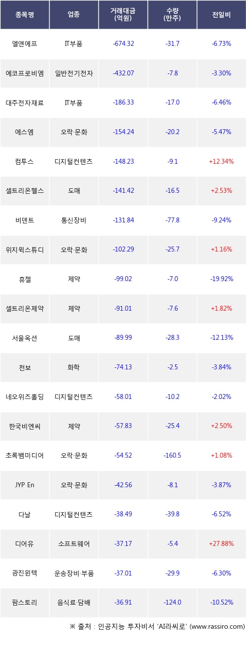 외국인 투자자의 순매도 상위 20개 종목은 엘앤에프, 에코프로비엠, 대주전자재료, 에스엠, 컴투스, 셀트리온헬스케어, 비덴트, 위지윅스튜디오, 휴젤, 셀트리온제약등이다.