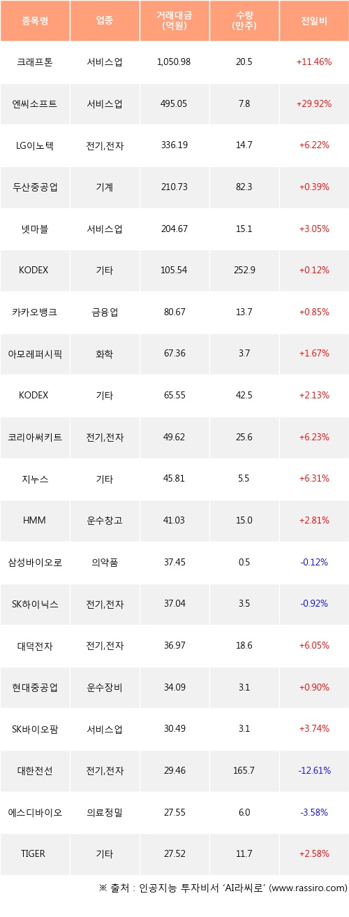 크래프톤, 엔씨소프트, LG이노텍 등은 전일 대비 주가가 상승했고, 삼성바이오로직스, SK하이닉스, 대한전선 등은 주가가 하락했다.