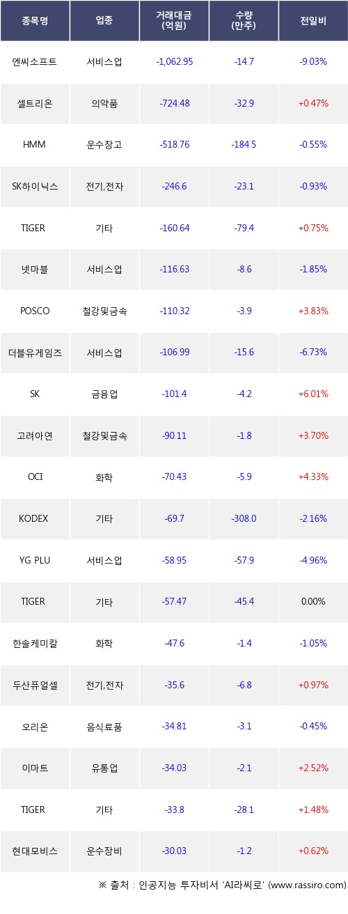 외국인 투자자의 순매도 상위 20개 종목은 엔씨소프트, 셀트리온, HMM, SK하이닉스, TIGER 차이나전기차SOLACTIVE, 넷마블, POSCO, 더블유게임즈, SK, 고려아연등이다.