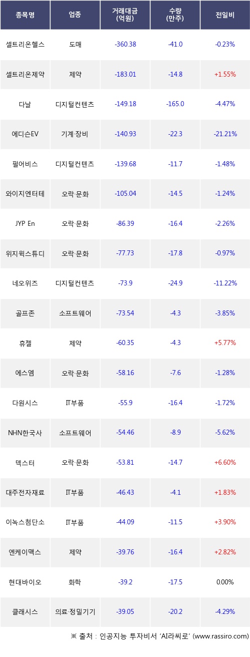 외국인 투자자의 순매도 상위 20개 종목은 셀트리온헬스케어, 셀트리온제약, 다날, 에디슨EV, 펄어비스, 와이지엔터테인먼트, JYP Ent., 위지윅스튜디오, 네오위즈, 골프존등이다.
