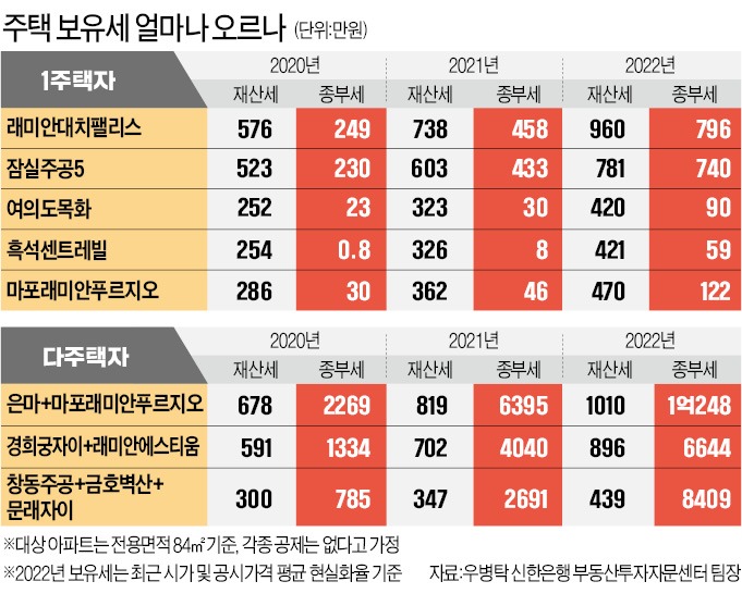 올 들어 급등한 가격과 내년에 상향되는 공시가격 현실화율, 종부세 공정시장가액비율 등을 적용하면 상당수 서울 시내 다주택자가 내년 1억원 안팎의 보유세를 부담할 전망이다. 은마아파트와 마포래미안푸르지오를 갖고 있을 경우 내년 종부세는 1억248만원으로 보유세 총액이 1억1259만원에 달한다. 래미안대치팰리스와 문래자이 소유자는 종부세 1억2719만원, 보유세로는 1억4021만원을 낼 전망이다.