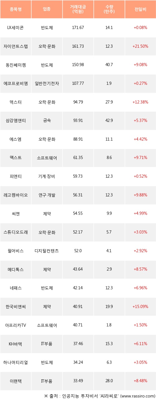 이날 외국인 투자자가 순매수한 종목들 중에 LX세미콘, 자이언트스텝, 동진쎄미켐 등은 전일 대비 주가가 상승했다.