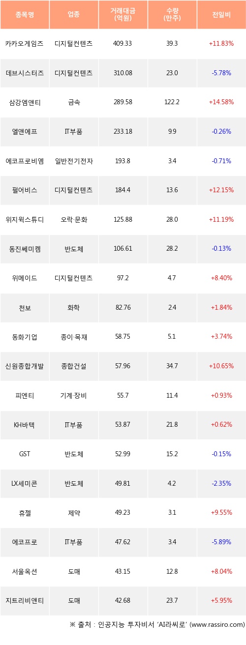 외국인 투자자의 순매수 상위 20개 종목은 카카오게임즈, 데브시스터즈, 삼강엠앤티, 엘앤에프, 에코프로비엠, 펄어비스, 위지윅스튜디오, 동진쎄미켐, 위메이드, 천보등이다.