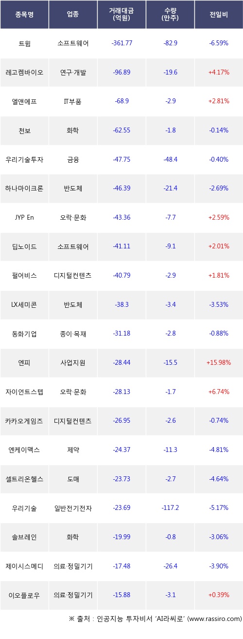 기관 투자자의 순매도 상위 20개 종목은 트윔, 레고켐바이오, 엘앤에프, 천보, 우리기술투자, 하나마이크론, JYP Ent., 딥노이드, 펄어비스, LX세미콘등이다.