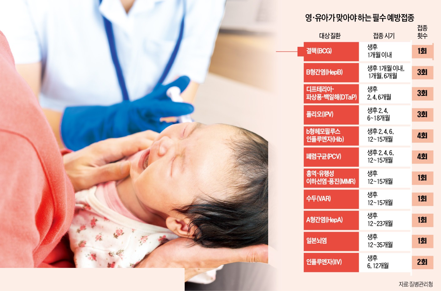이 밖에 하지 마비를 일으키는 ‘폴리오(소아마비·IPV), 뇌수막염·후두개염·폐렴 등을 유발하는 ‘b형헤모필루스인플루엔자(Hib)’, 급성 중이염·폐렴·균혈증 등의 원인이 되는 폐렴구균(PCV) 백신도 생후 2개월부터 두 달 간격으로 접종한다.