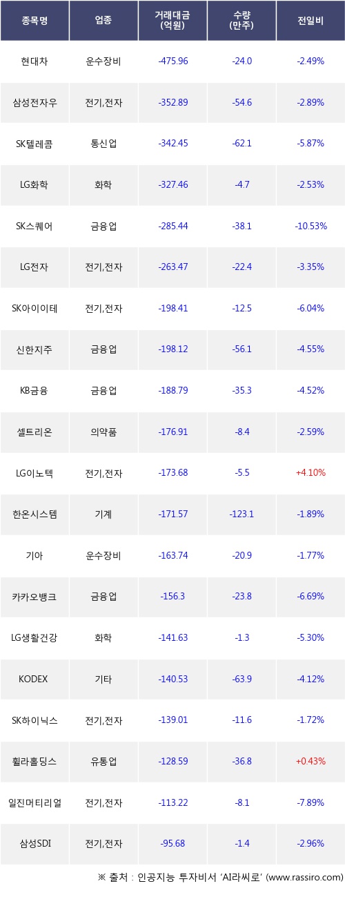 외국인 투자자의 순매도 상위 20개 종목은 현대차, 삼성전자우, SK텔레콤, LG화학, SK스퀘어, LG전자, SK아이이테크놀로지, 신한지주, KB금융, 셀트리온등이다.