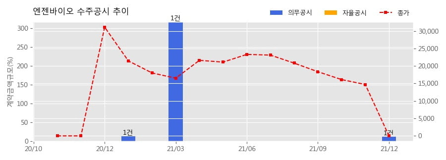 계약금액은 3억원 규모로 최근 엔젠바이오 매출액 24.8억원 대비 약 12.07 % 수준이다. 이번 계약의 기간은 2021년 11월 30일 부터 2022년 01월 29일까지로 약 1개월이다.