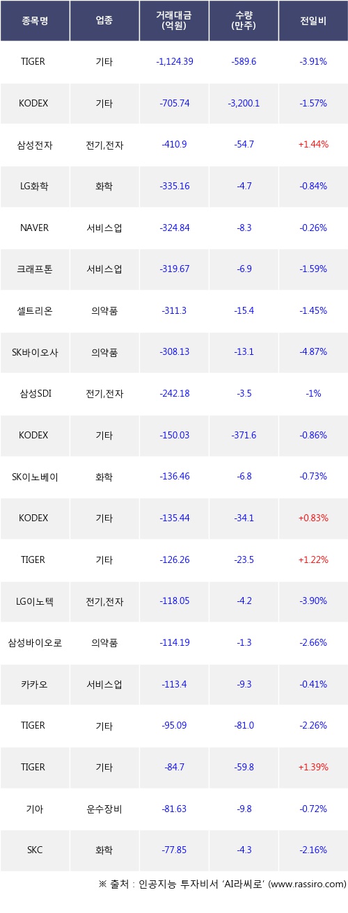 기관 투자자의 순매도 상위 20개 종목은 TIGER 차이나전기차SOLACTIVE, KODEX 200선물인버스2X, 삼성전자, LG화학, NAVER, 크래프톤, 셀트리온, SK바이오사이언스, 삼성SDI, KODEX 인버스등이다.