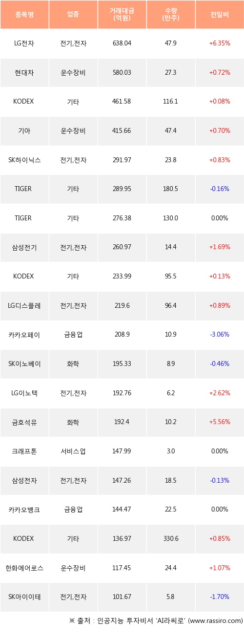 LG전자, 현대차, KODEX 200 등은 전일 대비 주가가 상승했고, TIGER MSCI Korea TR, 카카오페이, SK이노베이션 등은 주가가 하락했다.
