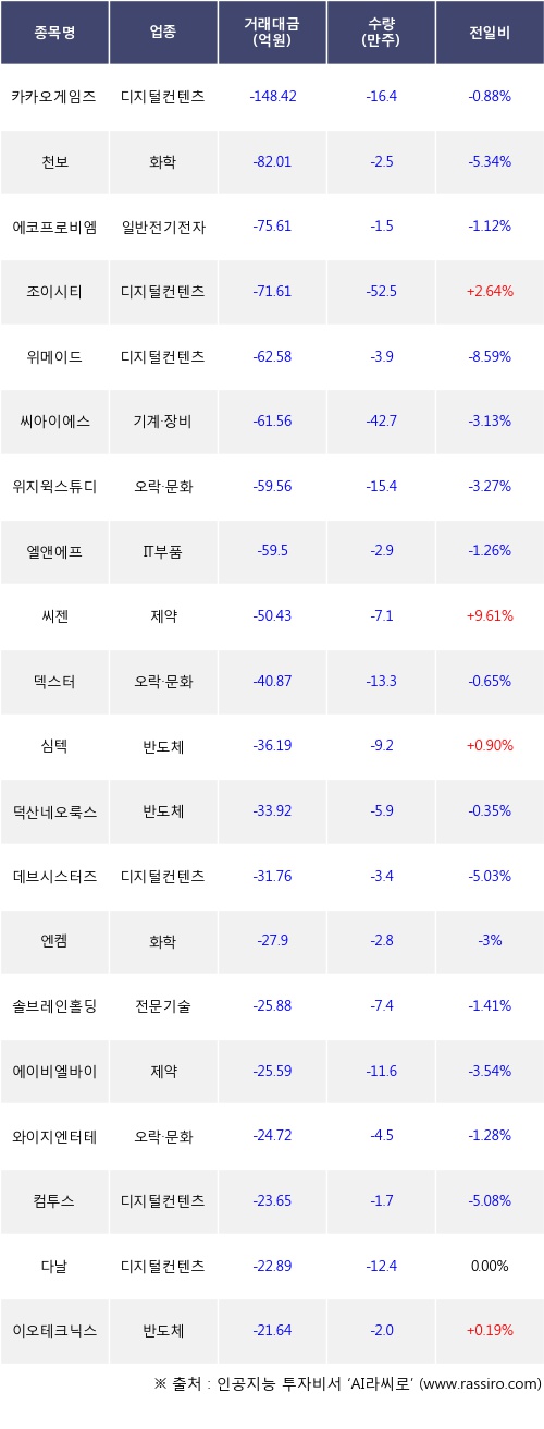 기관 투자자의 순매도 상위 20개 종목은 카카오게임즈, 천보, 에코프로비엠, 조이시티, 위메이드, 씨아이에스, 위지윅스튜디오, 엘앤에프, 씨젠, 덱스터등이다.