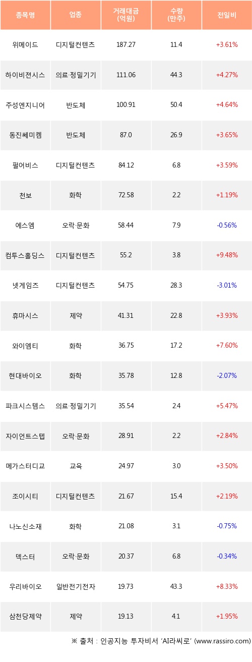 외국인 투자자의 순매수 상위 20개 종목은 위메이드, 하이비젼시스템, 주성엔지니어링, 동진쎄미켐, 펄어비스, 천보, 에스엠, 컴투스홀딩스, 넷게임즈, 휴마시스등이다.