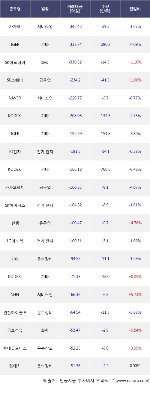외국인 투자자의 순매도 상위 20개 종목은 카카오, TIGER 미국필라델피아반도체나스닥, SK이노베이션, SK스퀘어, NAVER, KODEX 코스닥150 레버리지, TIGER 미국테크TOP10 INDXX, LG전자, KODEX 200선물인버스2X, 카카오페이등이다.