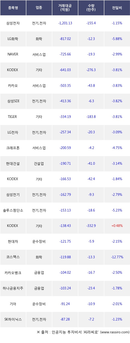 기관 투자자의 순매도 상위 20개 종목은 삼성전자, LG화학, NAVER, KODEX 레버리지, 카카오, 삼성SDI, TIGER 차이나전기차SOLACTIVE, LG전자, 크래프톤, 현대건설등이다.