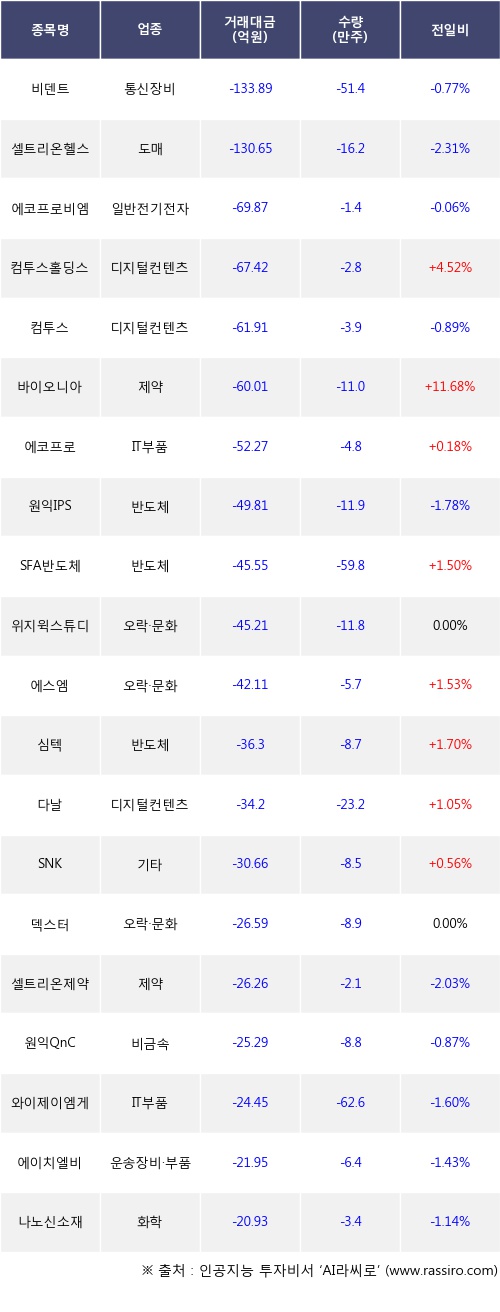 외국인 투자자의 순매도 상위 20개 종목은 비덴트, 셀트리온헬스케어, 에코프로비엠, 컴투스홀딩스, 컴투스, 바이오니아, 에코프로, 원익IPS, SFA반도체, 위지윅스튜디오등이다.