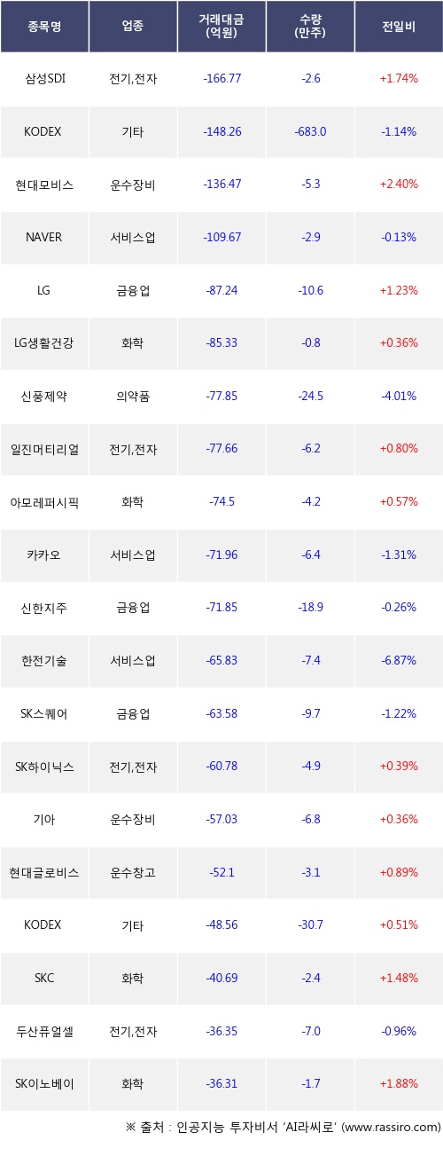 외국인 투자자의 순매도 상위 20개 종목은 삼성SDI, KODEX 200선물인버스2X, 현대모비스, NAVER, LG, LG생활건강, 신풍제약, 일진머티리얼즈, 아모레퍼시픽, 카카오등이다.
