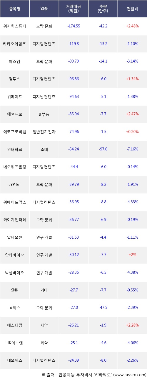 외국인 투자자의 순매도 상위 20개 종목은 위지윅스튜디오, 카카오게임즈, 에스엠, 컴투스, 위메이드, 에코프로, 에코프로비엠, 인터파크, 네오위즈홀딩스, JYP Ent.등이다.