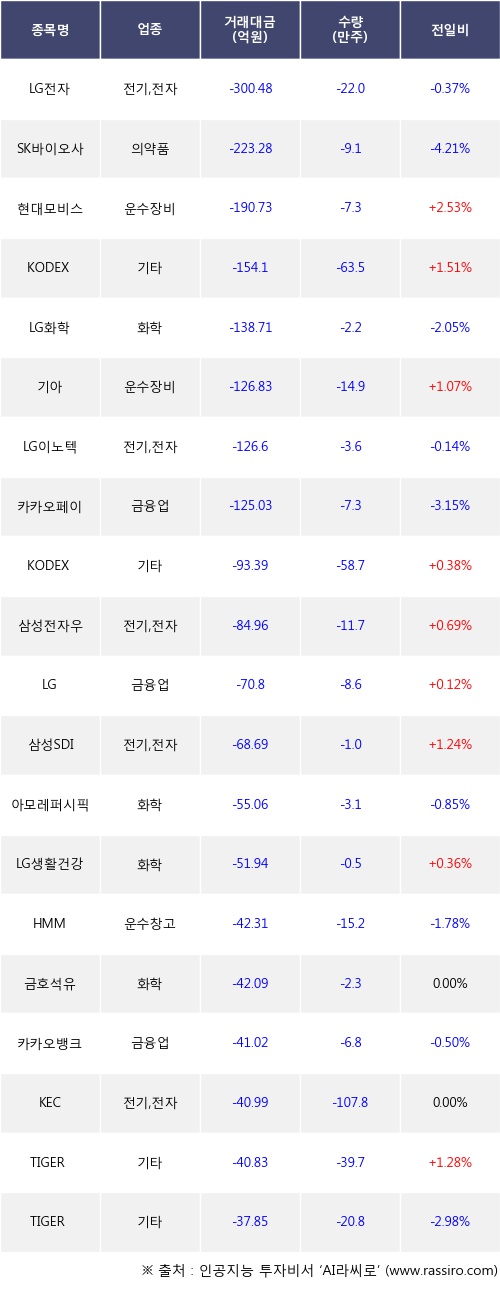 외국인 투자자의 순매도 상위 20개 종목은 LG전자, SK바이오사이언스, 현대모비스, KODEX 레버리지, LG화학, 기아, LG이노텍, 카카오페이, KODEX 코스닥150 레버리지, 삼성전자우등이다.