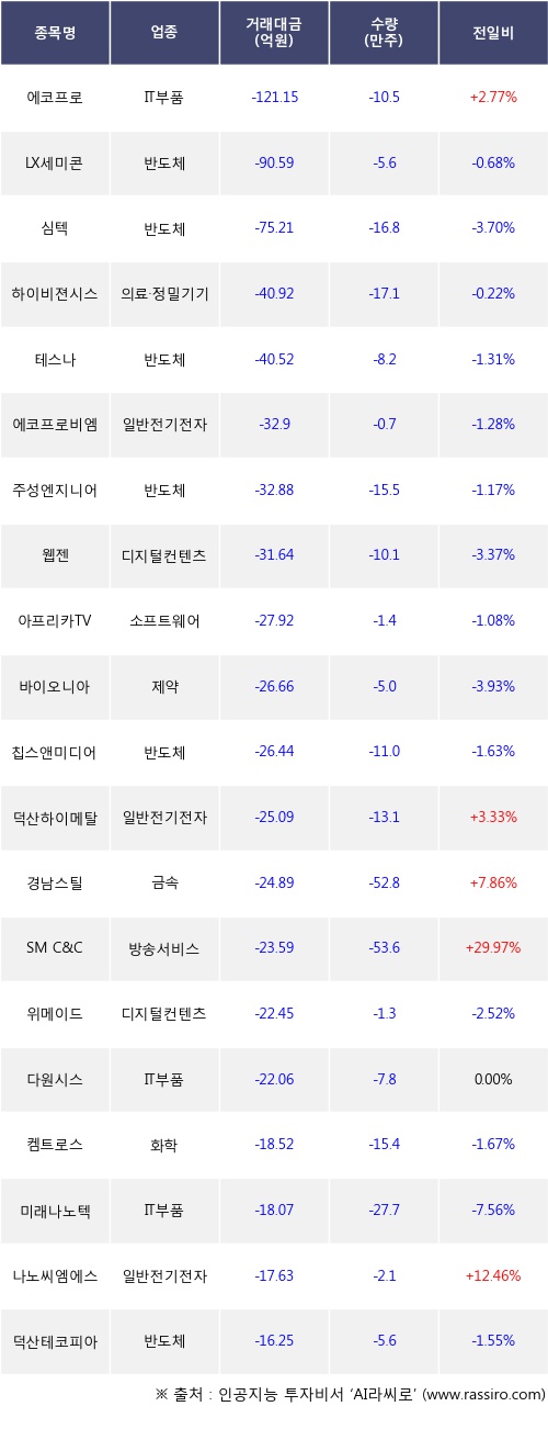 외국인 투자자의 순매도 상위 20개 종목은 에코프로, LX세미콘, 심텍, 하이비젼시스템, 테스나, 에코프로비엠, 주성엔지니어링, 웹젠, 아프리카TV, 바이오니아등이다.