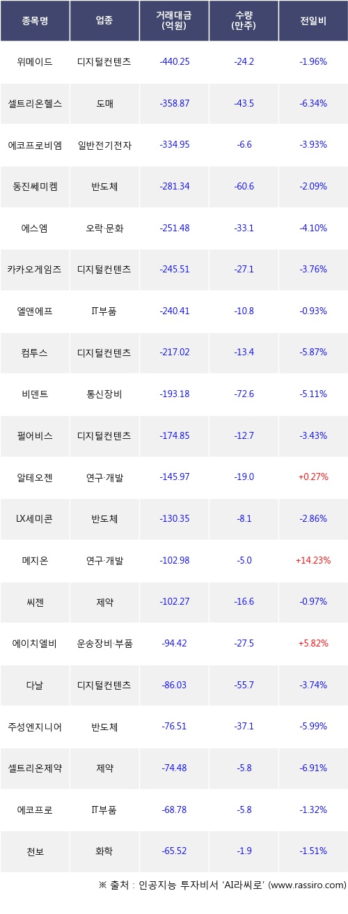 기관 투자자의 순매도 상위 20개 종목은 위메이드, 셀트리온헬스케어, 에코프로비엠, 동진쎄미켐, 에스엠, 카카오게임즈, 엘앤에프, 컴투스, 비덴트, 펄어비스등이다.