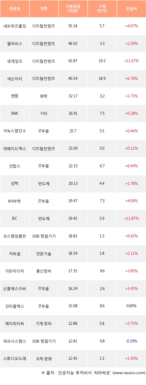 기관 투자자의 순매수 상위 20개 종목은 네오위즈홀딩스, 펄어비스, 넷게임즈, 넥슨지티, 엔켐, SNK, 이녹스첨단소재, 위메이드맥스, 인탑스, 심텍등이다.