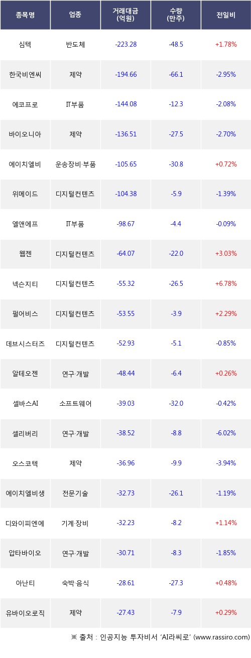 외국인 투자자의 순매도 상위 20개 종목은 심텍, 한국비엔씨, 에코프로, 바이오니아, 에이치엘비, 위메이드, 엘앤에프, 웹젠, 넥슨지티, 펄어비스등이다.
