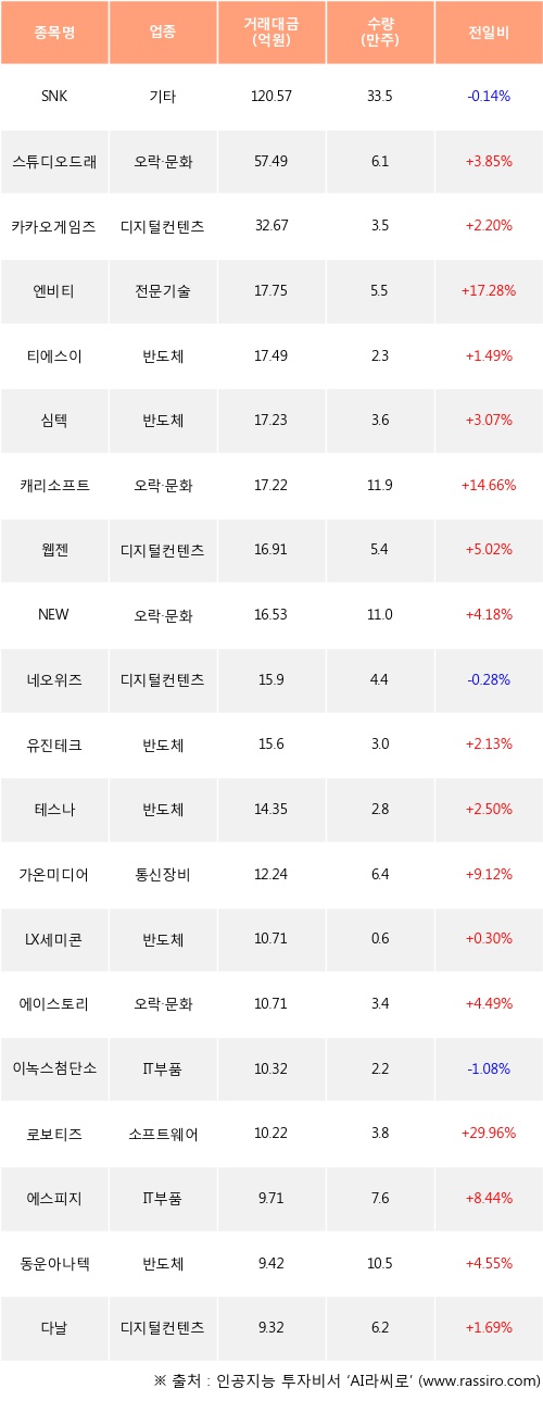 기관 투자자의 순매수 상위 20개 종목은 SNK, 스튜디오드래곤, 카카오게임즈, 엔비티, 티에스이, 심텍, 캐리소프트, 웹젠, NEW, 네오위즈등이다.