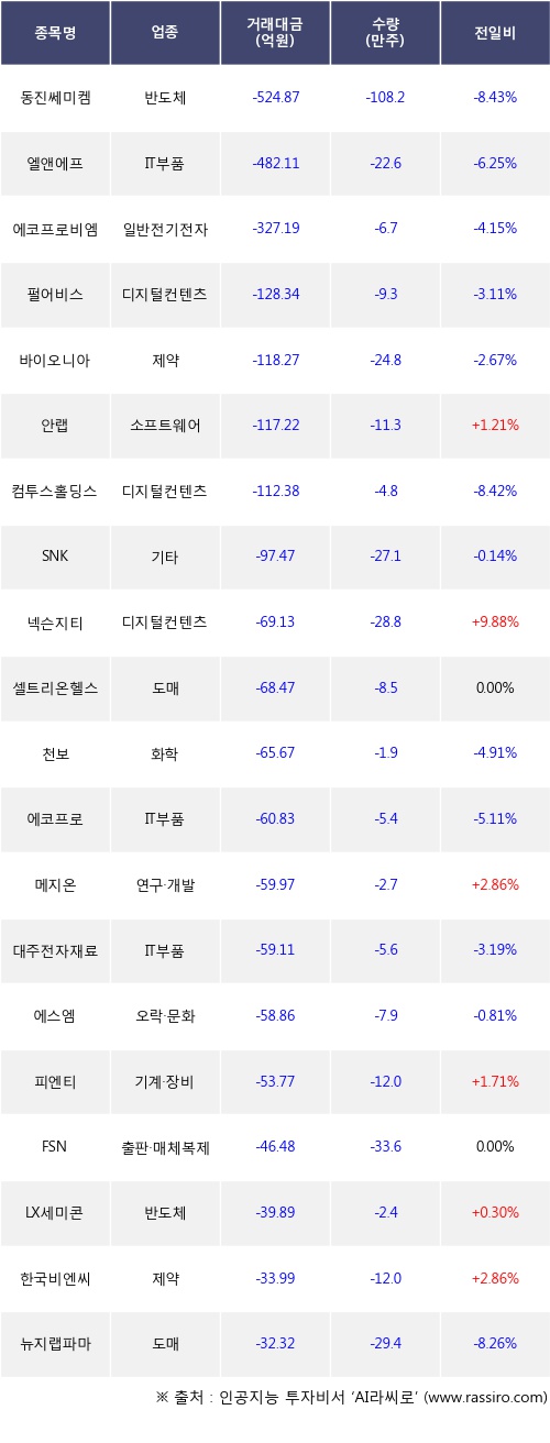 외국인 투자자의 순매도 상위 20개 종목은 동진쎄미켐, 엘앤에프, 에코프로비엠, 펄어비스, 바이오니아, 안랩, 컴투스홀딩스, SNK, 넥슨지티, 셀트리온헬스케어등이다.