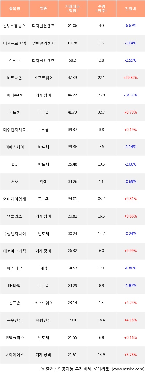 비트나인, 파트론, 대주전자재료 등은 전일 대비 주가가 상승했고, 컴투스홀딩스, 에코프로비엠, 컴투스 등은 주가가 하락했다.